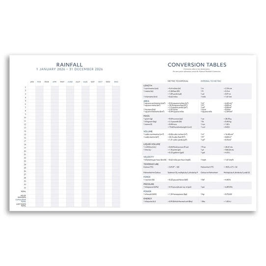 Features: week-to-a-page layout for 2026, year planners for 2026/2027, school/public holidays, key dates, conversion table, rainfall chart, and contacts page